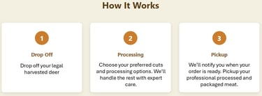 Processing time varies depending on the season and current volume. During peak season (November-December), processing typically takes 7-10 days. During slower periods, we can often complete processing in 3-5 days. Our tracking system allows us to give you a more accurate estimate when you drop off your deer.
